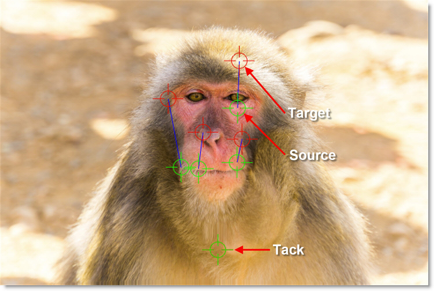 A total of 20 pins can be added to an image. Pins have a source (green circle) and target (red circle). The farther the target is dragged from the source, the more the image warps.