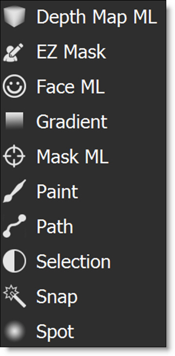 Using the Add Mask icon in the Layers window, one of seven mask types can be applied to a layer: Depth ML, EZ Mask, Face ML, Gradient, Mask ML, Paint, Path, Snap, Spot, and Selection. Masks can be used to limit where a filter is applied to an image and are displayed to the right of the layer’s image thumbnail in the Layers window.